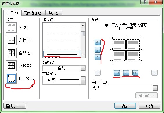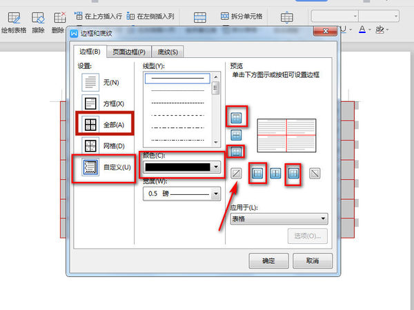 5、在“边框和底纹”边框中选择表格的颜色,如果只需设置表格内框的颜色,先点击“全部”将表格设置为红色,然后如图再选择“自定义”,点击选择颜色为黑色,如图在预览处将表格的外框线条点击一次,点击完成后确定。