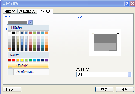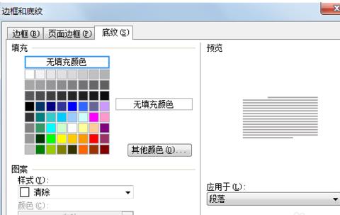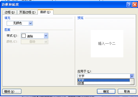 3、弹出边框和底纹对话框,选择底纹选项卡,在填充处以无颜色;在应用于处,根据具体情况进行选择,如图所示。