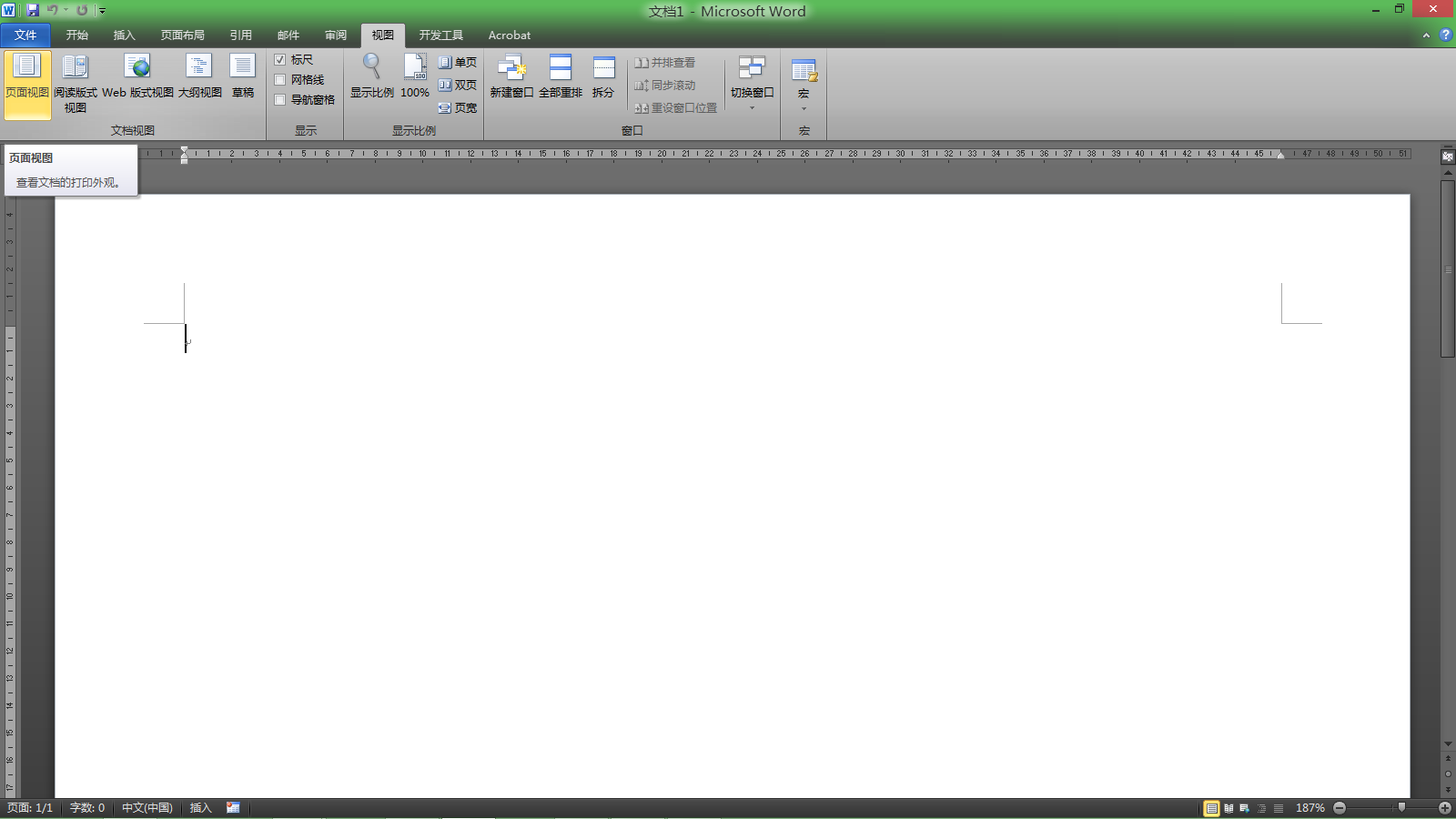 如图所示,新建或打开Word文档,切换至“视图”选项卡,单击“页面视图”按钮。