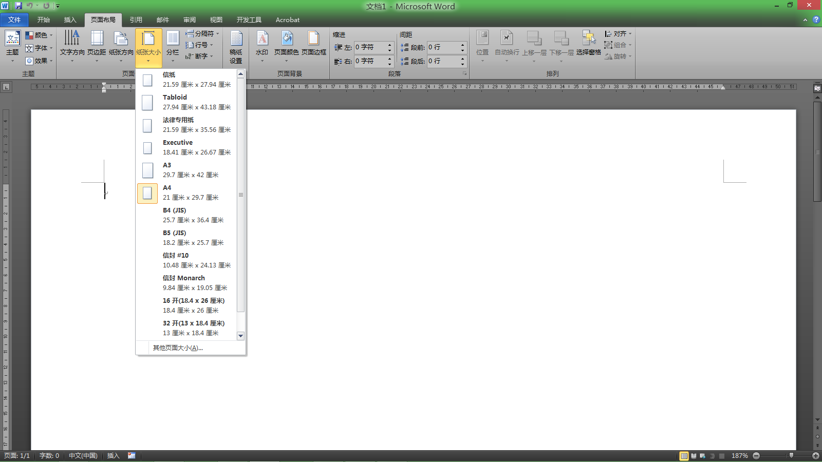 如图所示,将光标定位在要查看页面的合适位置,切换至“页面布局”选项卡,单击“纸张大小”按钮展开下拉列表,其中,高亮显示的列表项就是页面大小,本例为A4。