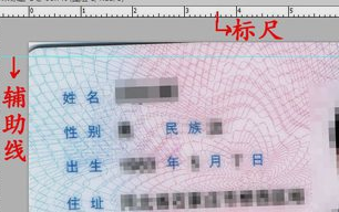 6.那么我们做如何调整呢,首先先拖出一条辅助线,辅助咱们对齐身份证用。辅助线的拖动如下:首先文档得有标尺,如果没显示的话点击“视图----标尺”就OK了,然后鼠标放在标尺上按下左键不松,往文档方向拖动,就会出现一条辅助线(练习练习一下吧)。如图6为拉好辅助线以后的图。