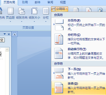 2、将光标定位在文档的尾部,单击页面布局----分隔符----分节符----连续即可,如图所示。