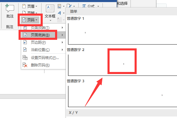2、在插入界面点击“页码”按钮,然后点击“页面底端”按钮,在页码样式中选择居中显示的页码: