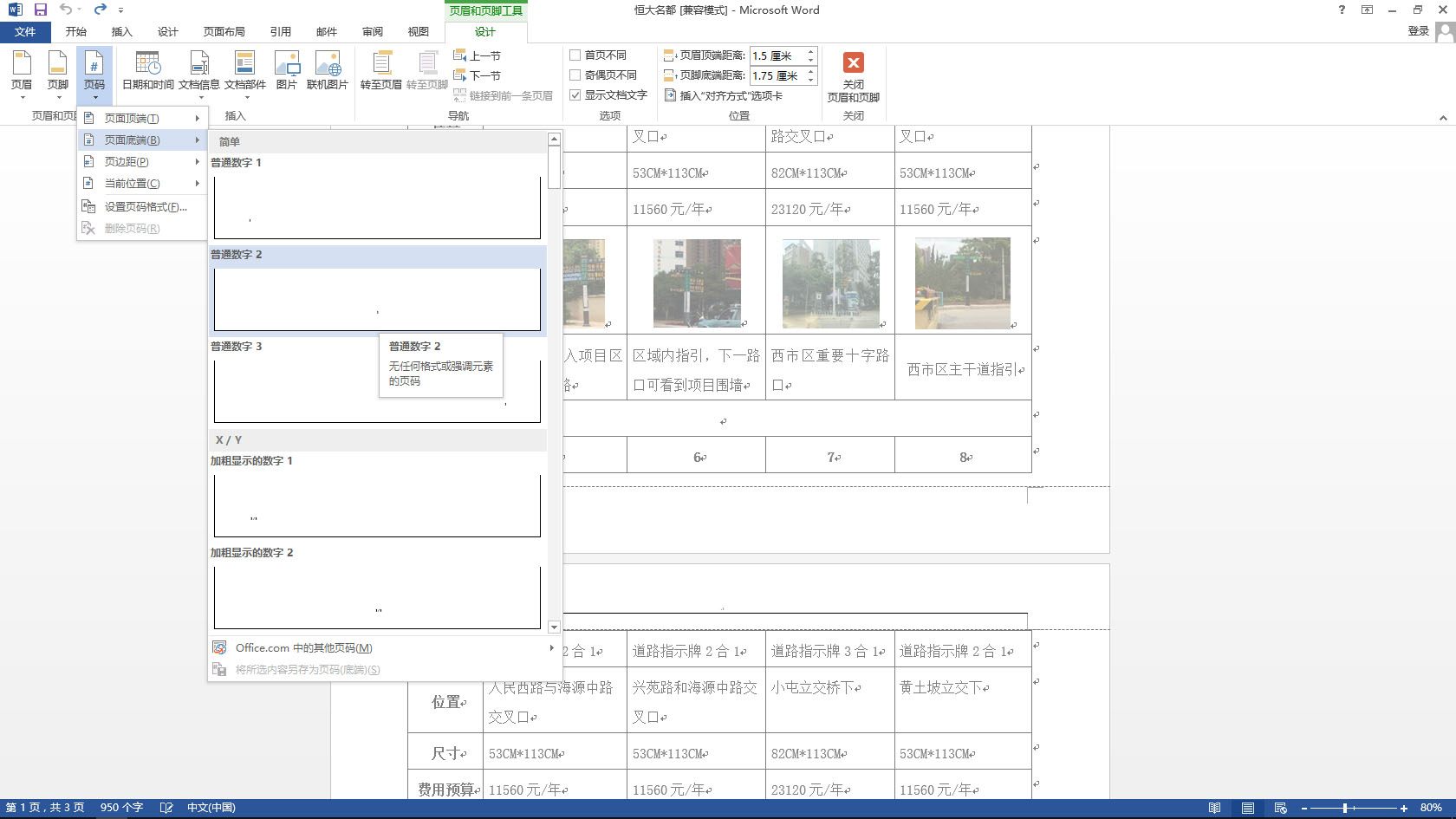 1、双击页脚的位置,即可进入“页眉和页脚工具设计”菜单,然后单击“页码”如图所示,选择页码居中的一项,即可插入页码: