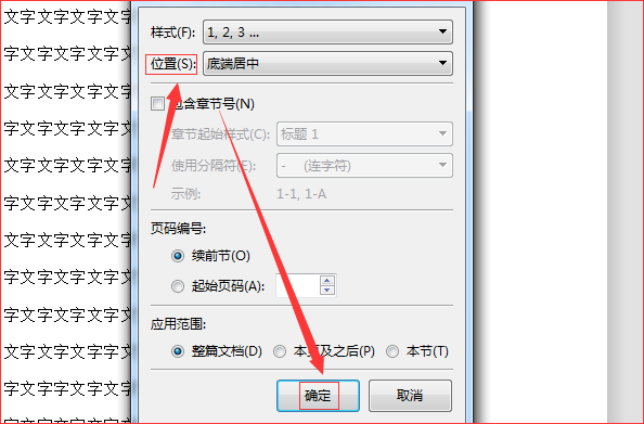 4、在对话框的“位置”处,点击倒三角符号,在弹出的下拉列表中选择“底端居中”,然后点击“确定”。