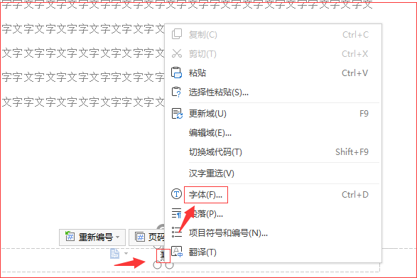 6、选中页码,然后点击鼠标右键,在弹出的右键菜单中点击“字体”。