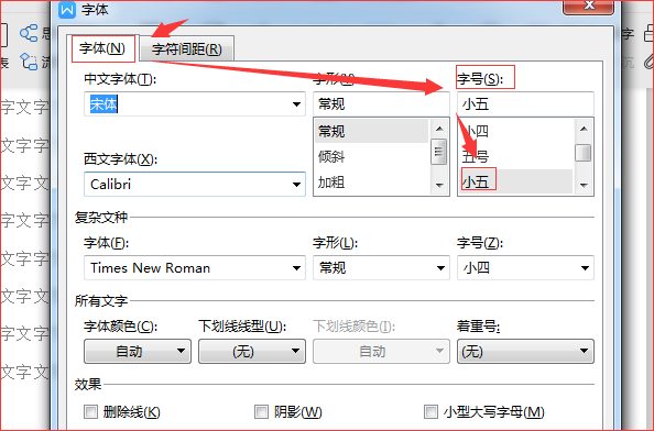 7、在图案出的“字体”对话框中,点击“字体”选项卡,在“字号”处,选择“小五”,最后点击“确定”。