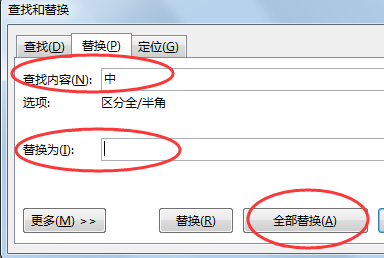 3、点击“替换”即可弹出“查找和替换”对话框,在“查找内容”内输入“中”,在“替换为”内不输入任何字符,点击“全部替换”。