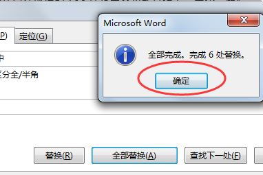 5.最后不断重复的点击【全部替换】按钮,点击次数不限,直到弹出一个对话框窗口【word已完成对文档的搜索并已完成0处替换】为止。