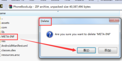 1、首先,删除apk包中的签名文件。在左侧的压缩文件中,找到META-INF选项,并删除。