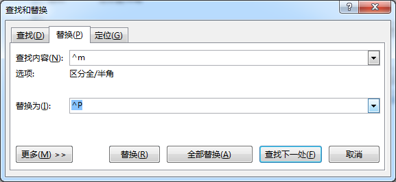 2、在“替换”选项卡中,在“查找内容”框内输入^m,在“替换为”框内输入^p,然后执行“替换”或“全部替换”即可。