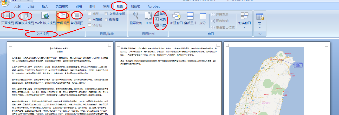点击上面的“视图”工具→找到下面的“文档视图”栏,上面有多种视图方式,挨个点击,就会找到需要的视图了。 “显示比例”中还有“单页”“双页 ”、比例等显示方式。