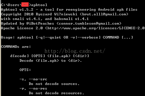 启动控制台,输入apktool,回车可查看到apktool工具常用指令