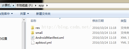 接下来,apktool d f:\app-debug.apk f:\app像这样输入,这里的f:\app-debug.apk是你的将要被反编译的apk的绝对路径,后面的f:\app是apk反编译后资源文件将要放入的文件夹,不需要事先新建好,在这里写好就行了,输入完回车,如果成功的话,即可在文件夹中看到资源文件,这里apktool的流程算完了。