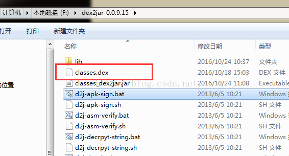 1.把你将要反编译的apk的扩展名改成压缩包的扩展名(rar\zip等),然后对其解压,找到classes.dev文件,将之复制后贴到dex2jar底下,效果如如下: