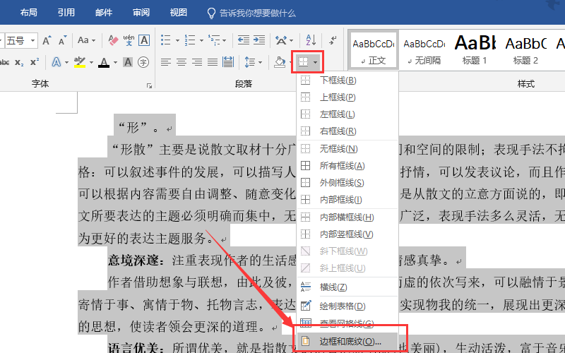 2、选中文章,点击“边框”选项,在下拉菜单中,点击最下方的“边框和底纹”;