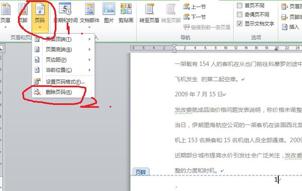 3、在单击“页码”选项后出现的下拉菜单中,单击“删除页码”,这样就删除了页码。