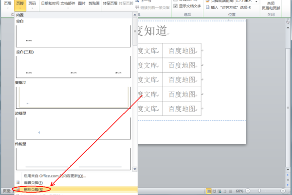 3、继续点击左上角“页脚”,在弹出下拉菜单中,选择“删除页脚”;