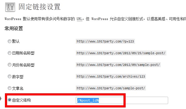 wordpress的伪静态也做的很优秀,他可以通过后台选择多种链接模式。在设置---固定链接----自定义,输入/%post_id% 这样在文章发布之后,所显示的链接就是www.xx.com/123,如下图: