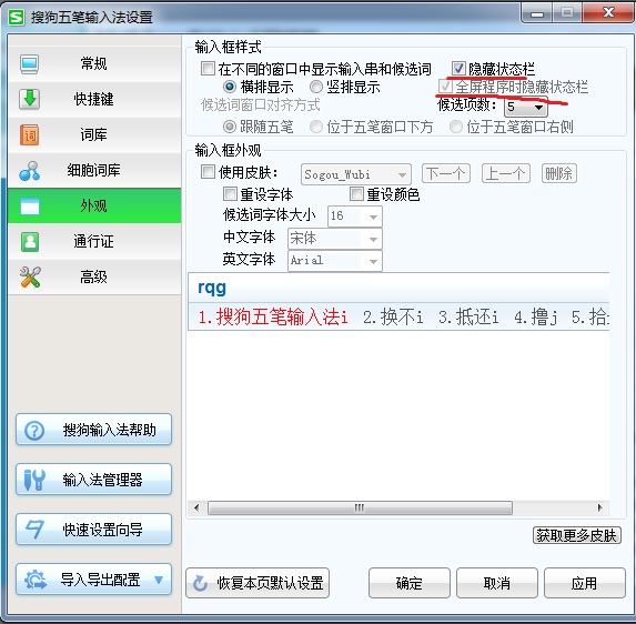 2、在“外观”选项卡中去掉“隐藏状态栏”和“全屏程序时隐藏状态栏”前面的对勾,然后点右下角的“确定”