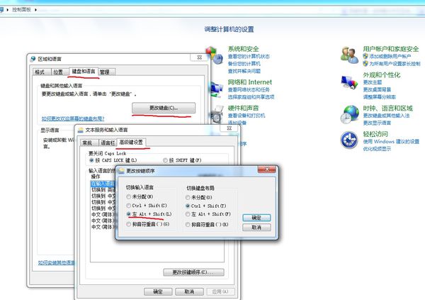 2、在弹出的对话框中选择“键盘和语言”→“更改键盘”→“高级键盘设置”→“更改按键顺序”。在弹出的对话框中可以看到切换输入法的快捷键,利用快捷键可以调出输入法。