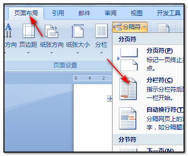 6、在页面布局选项卡中单击分隔符按钮,在下拉列表中选择分栏符,即可在光标位置处进行分栏;