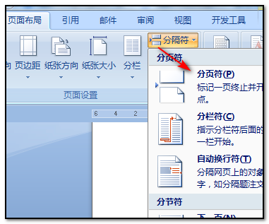 7、在页面布局选项卡中单击分隔符按钮,在下拉列表中选择分页符,即可在光标位置处进行分栏。