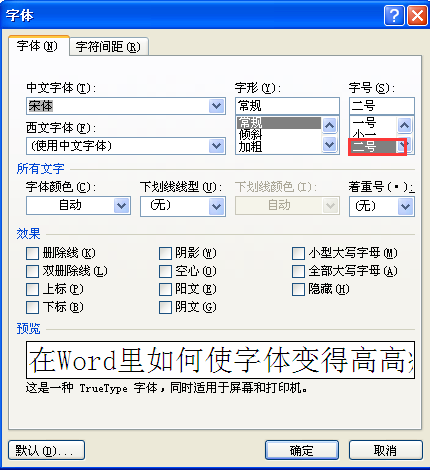 3、弹出字体对话框,在字号处选择二号;