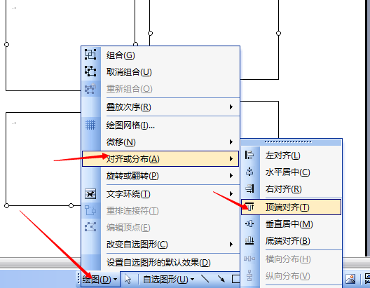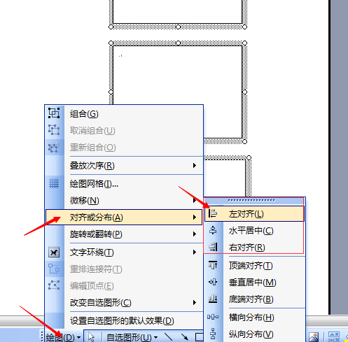 3、选中这三个文本框(Shift+左键),点击绘图工具栏上的“绘图”-“对齐或分布”-“左对齐”。(由于是同样大小的三个文本框,所以选择“左对齐”、“右对齐”“水平居中”效果一样。)
