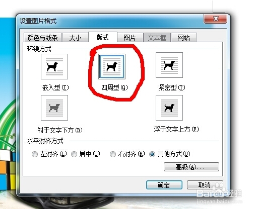 word2007或者更高版本可以选择“插入——图片——右双击图片”则会在菜单中弹出一个新的选项卡,在这个选项卡中选择带小狗的图标,在弹出 的菜单中选择“四周型”或“嵌入型”