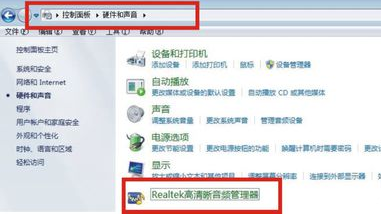 1、先把你的音箱音频线拔下来,暂时不连接上,在控制面板中打开硬件和声音按钮,出现的界面如下图所示,点击其中的音频管理器。