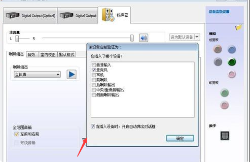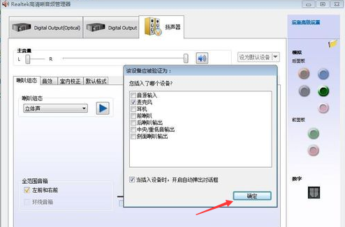 3、在上一步弹出的“目前连接的设备应辨识为”对话框,根据你插入的设备来选择就行,这里我们是插入音箱嘛,所以勾选音源输入即可,最后点击确定。