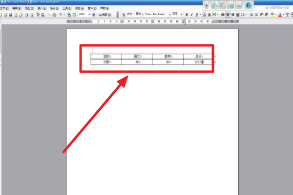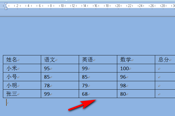 3、输入表格里面的内容,把光标放到总分上。