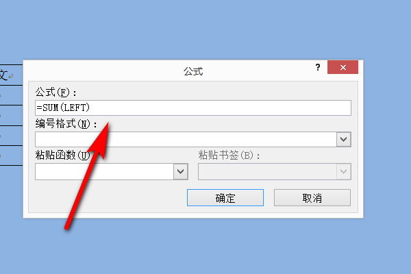 5、弹出来公式的对话框,公式输入为=sum(left),括号里的英文是指左边,也就是对左边的数求和。