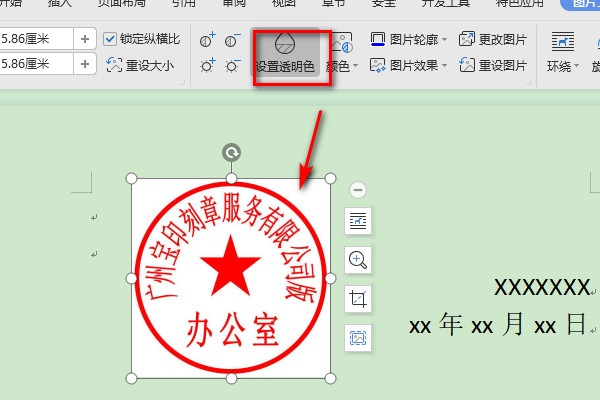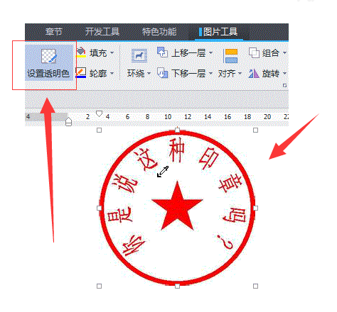 六、然后,将电子公章拖到合适的位置,在上方菜单中选择“图片工具”,选择“设置透明度”点击图片,电子公章变成透明。