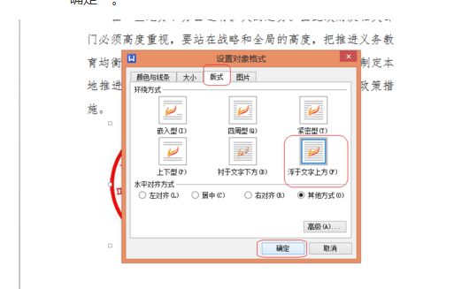 3.选择“版式”选项卡,环绕方式选择“浮于文字上方”,水平对齐方式 选择“其他方式 "——”确定“。