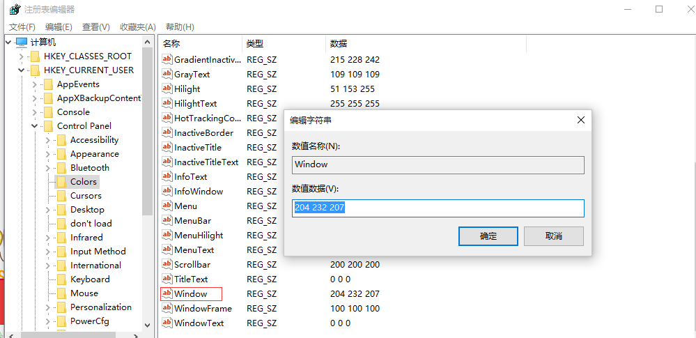 依次展开“HKEY_CURRENT_USER-Control Panel-Colors”-在右侧找到window右键window选择修改,输入204 232 207,确定。