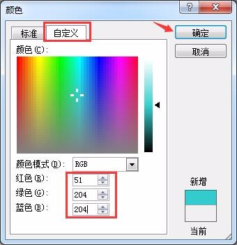 2、点击“自定义”选项卡,然后在RGB对应的值中输入(51,204,204),因为水绿色的RGB值为51,204,204,输入完后按“确定”按钮,如图: