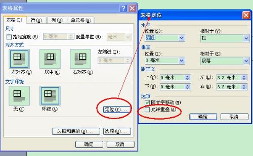 选中表格,单击右键选择"表格属性"命令,打开"表格属性"对话框,单击"表格"选项卡,单击"定位",打开"表格定位"对话框,去掉"允许重叠"前的勾选