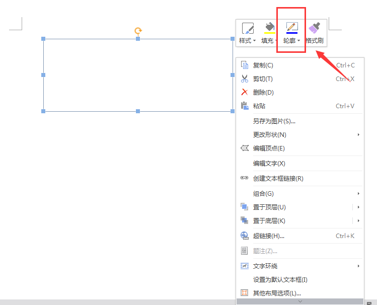 ②、需要选中文本框,右击,弹出对话框。选择“轮廓”