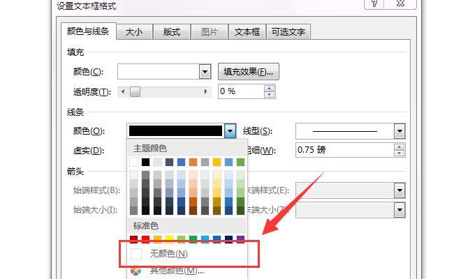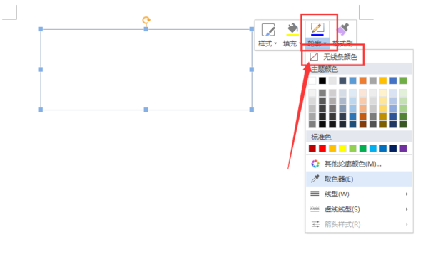 ③、然后点击“轮廓”,这里可以任意选择文本框轮廓颜色,选择“无线条颜色”,即可去掉文本边框。