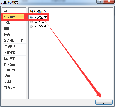 打开“设置形状格式”界面,点击“线条颜色”,然后点击选中“无线条”,点击右下角的“关闭”按钮;