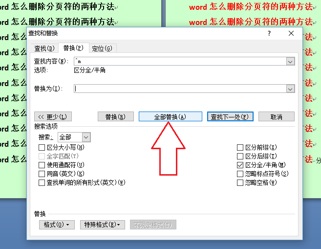 这时候就在“查找内容”中,出现了一个“^m”,当然,下次熟悉了,直接在“查找内容中输入“^m”即可,不需要点击“特殊格式了”,最后点击“全部替换”,如果只想替换部分,就点击“替换”,一个个地替换。