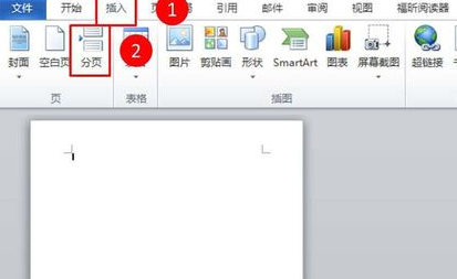 2、插入分页符。要插入分页符,首先我们需要确定分页符的插入位置。比如,我们想将分页符插入至第2页和第3页之间,那么我们就将鼠标移动至第2页,在第2页页面上点击鼠标左键,这样就选中第2页了。然后,在菜单栏中点击【插入】选项(图示1位置)。接着在工具栏中点击【分页】按钮(图示2位置),这样分页符就被成功插入到第2页和第3页之间了。