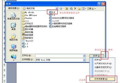 2、在“打开”对话框中,选择出问题的文档上,选中后单击右下角“打开”按钮的三角箭头,出来的下拉菜单选择“打开并修复”命令。(见下图)
