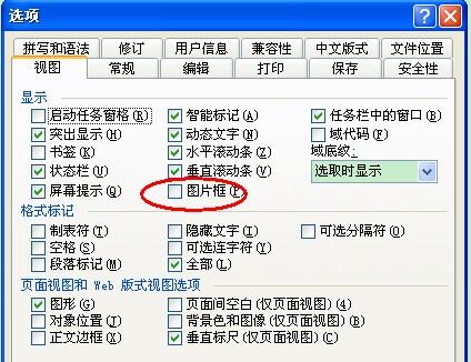 单击菜单“工具-----选项”打开对话框后点击“视图”去掉“显示图片框”前面的钩。