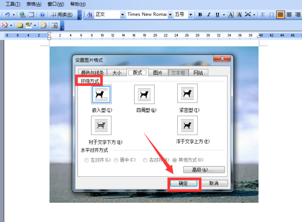 切换到“版式”的界面后,在“环绕方式”里可以看到第一个就是默认的“嵌入型”,可以根据实际需要,选择其它的方式,比如四周型、衬于文字下方等等,选好后,再点击“确定”的按钮即可。