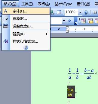 如果是利用Word的公式编辑器插入的公式,那么可以直接选中需要添加颜色的文本,然后设置字体颜色;如果是利用Mathtype插入的公式,那就在Matytype软件中依次选择 格式→颜色进行设置即可。下面给出图示: