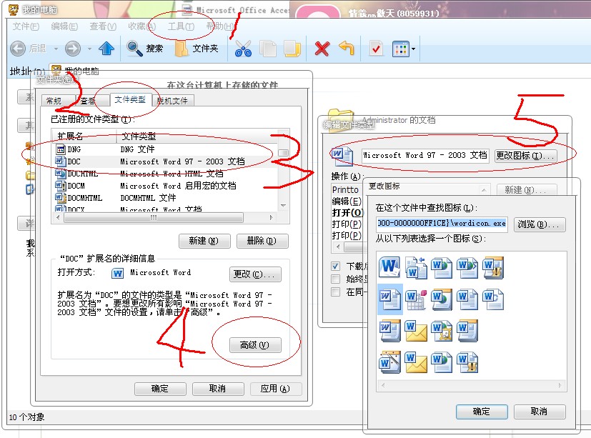 2、默认打开程序是WORD,只是图标不对。继续1,,找下边有一个“高级”按钮,点击它,打开一个新的对话框,出现一个“更改图标”按钮,点它之后,就可以改成你想要的图标了。