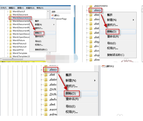 2、对于 Word 2007/Word 2010,请找到以下三个键值。(然后分别右击选择“导出”,把键值备份至桌面。一旦发生问题,可以通过备份来恢复注册表键值)HKEY_CLASSES_ROOT\.docx 、KEY_CLASSES_ROOT\Word.Document.12 、HKEY_CURRENT_USER\Software\Microsoft\Windows\CurrentVersion\Explorer\FileExts\.docx之后再分别右击这三个键值并删除。